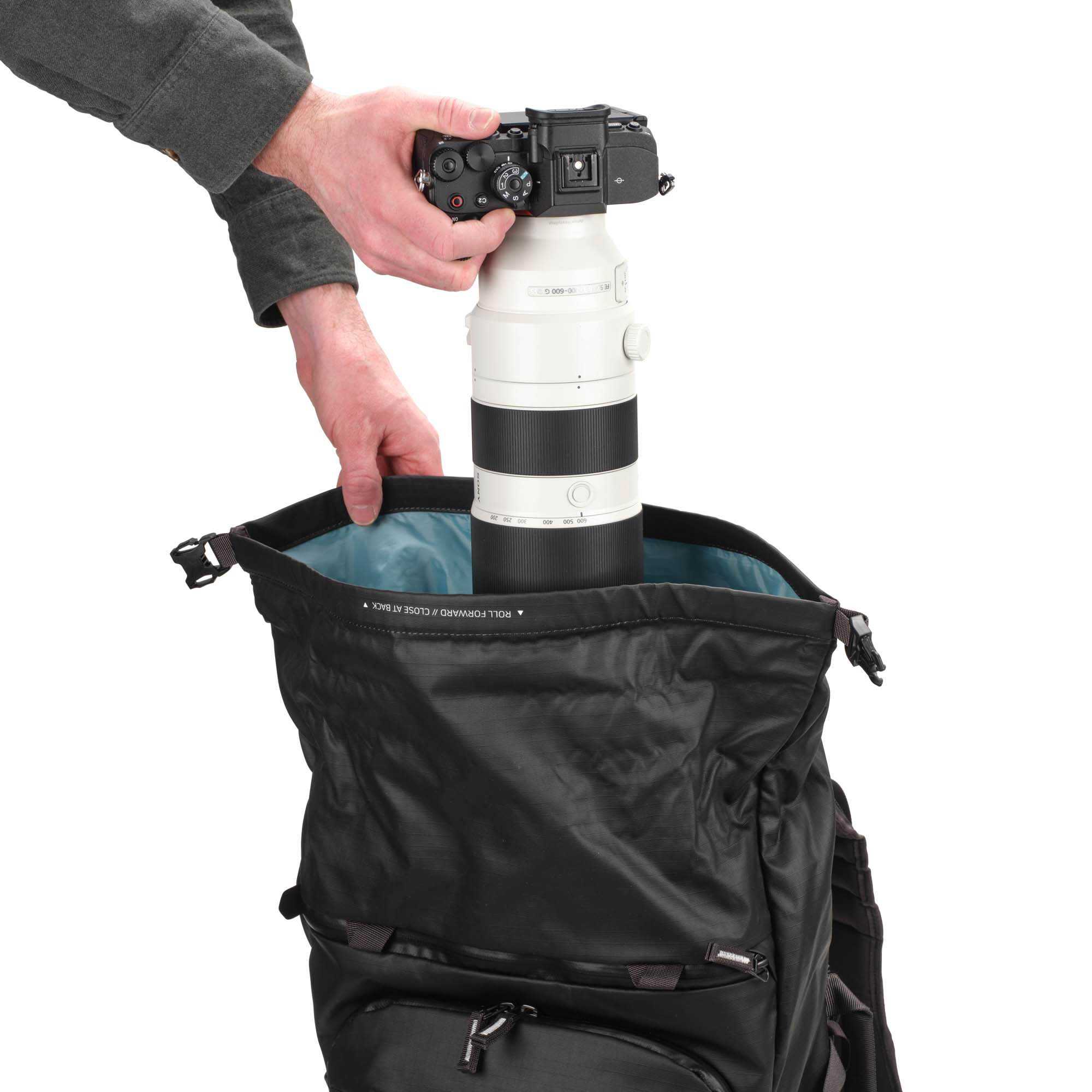 Integreert naadloos met de zijtoegang van de X30. Biedt ook toegang tot camera/lens via de ritssluiting aan de basis van de uitrekbare rolltop en standaard toegang via de achterkant tot het volledige camerasysteem.