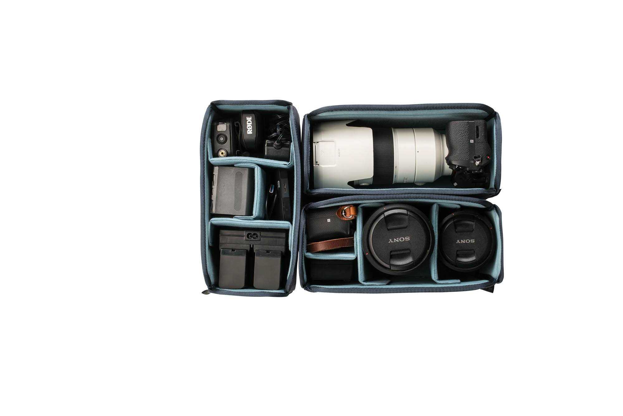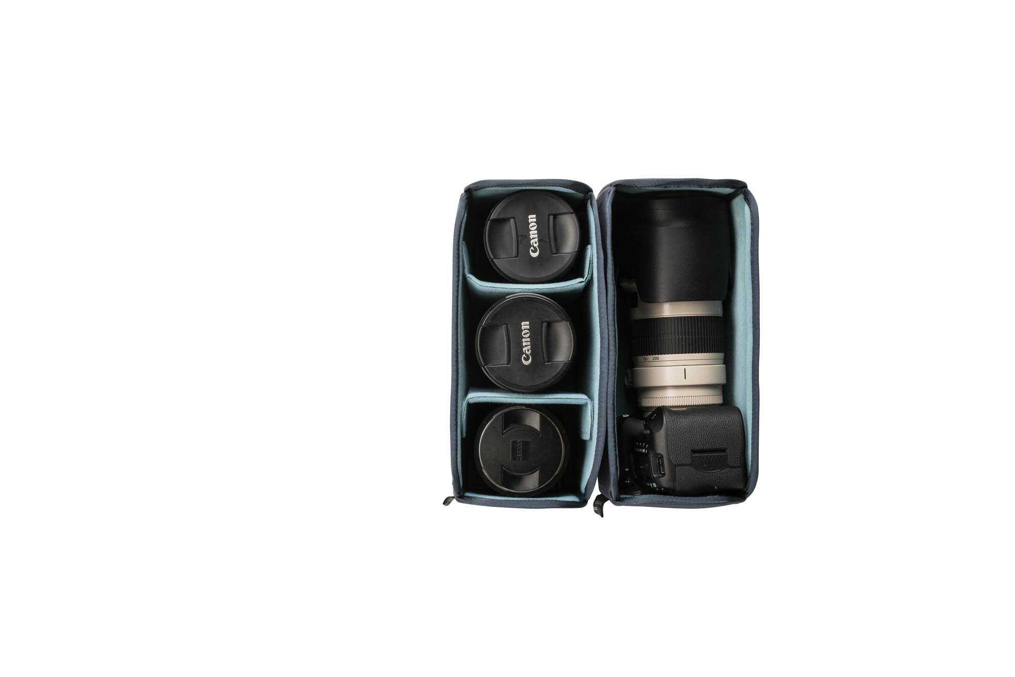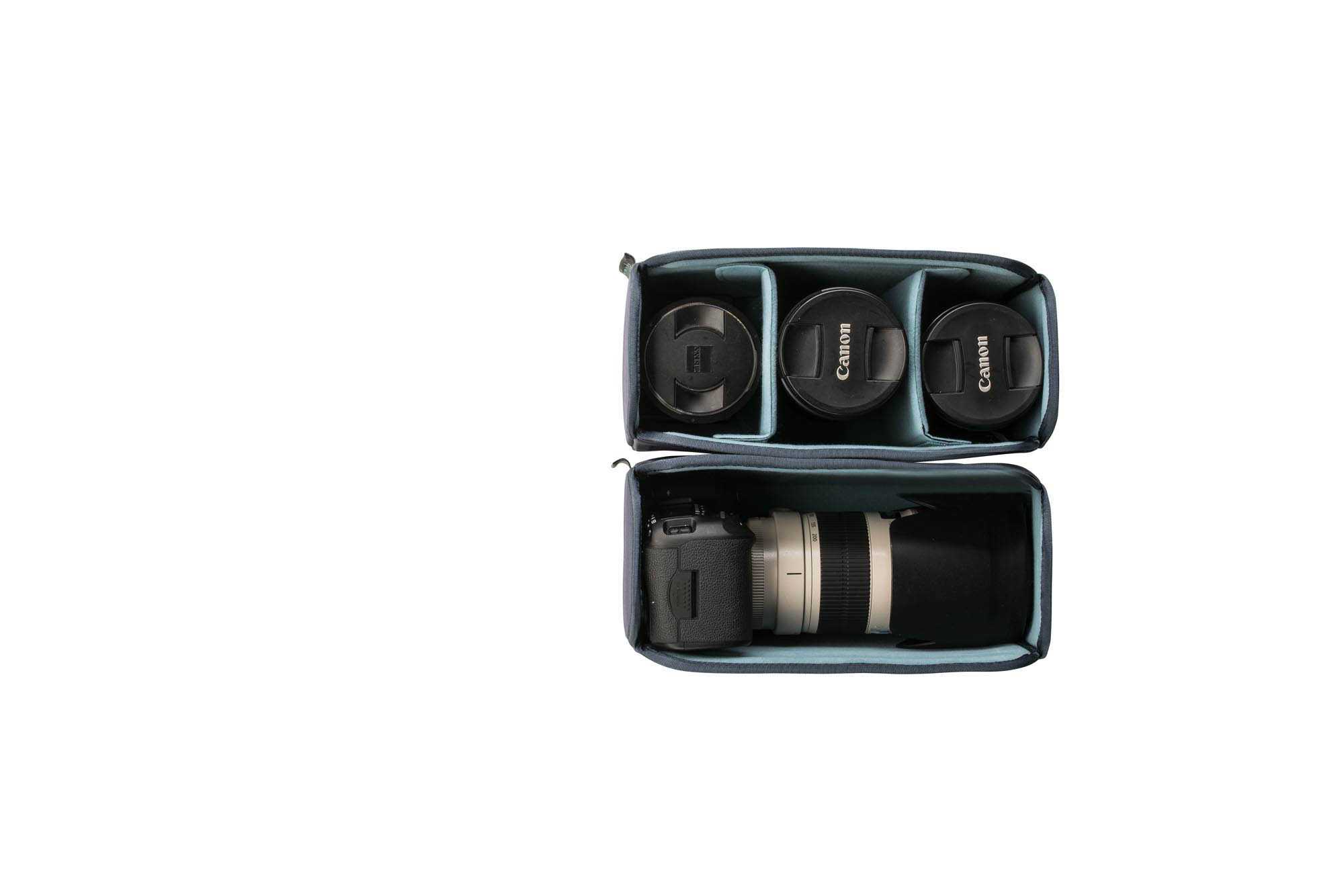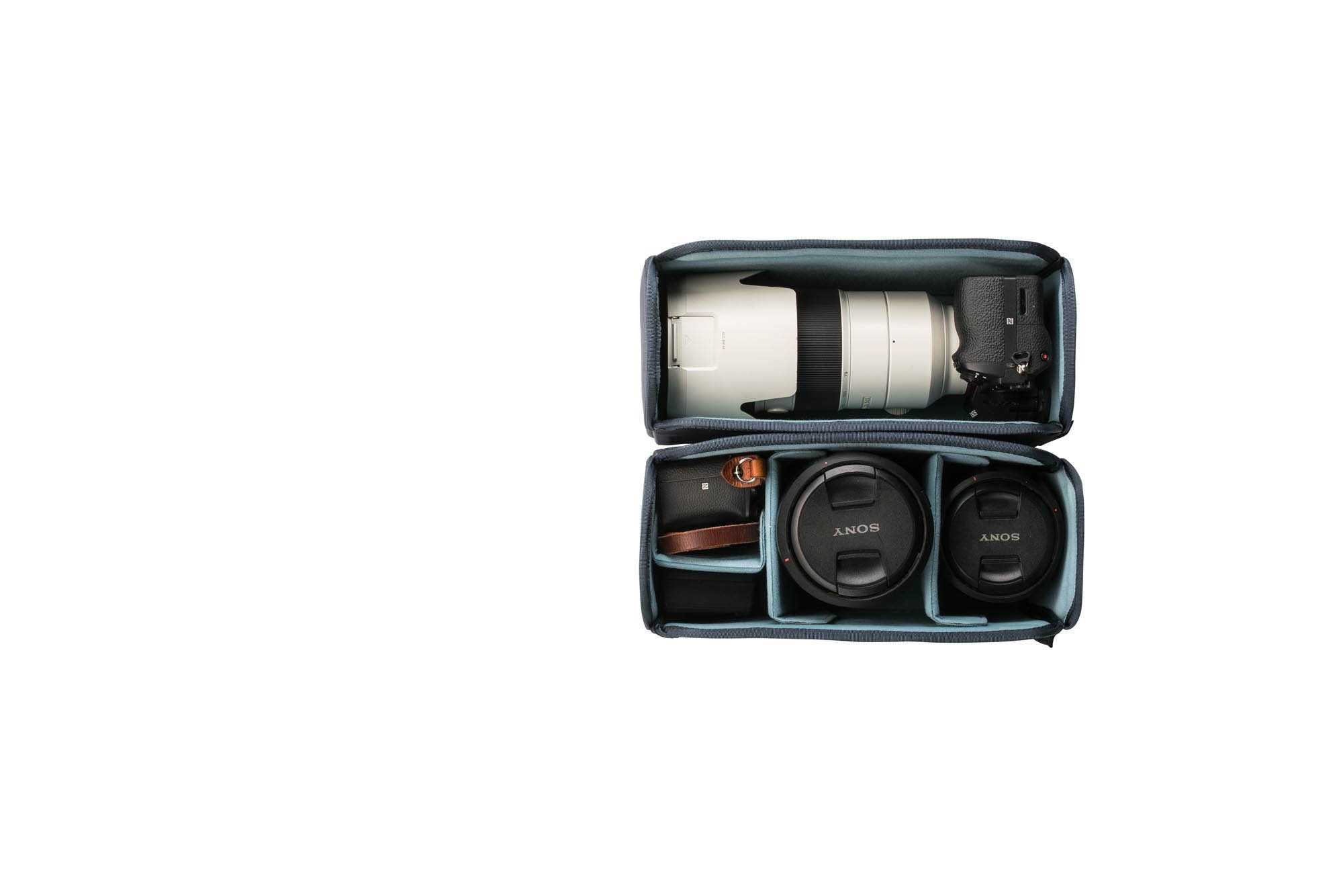 Ontworpen om een mirrorless of niet-gegripte DSLR-body met een gemonteerde lens tot 70-200mm f/2.8 te dragen. Optioneel biedt het ruimte voor 2-3 extra lenzen en accessoires.