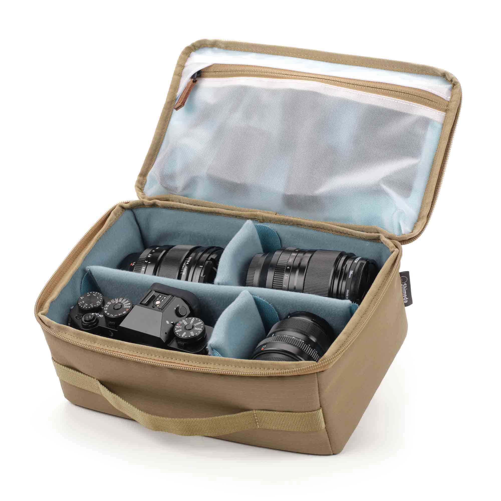 Een zachte, gewatteerde case voor compacte camerasets, zoals die van Leica, Fuji, OM, GoPro, DJI en Sony (APS-C).