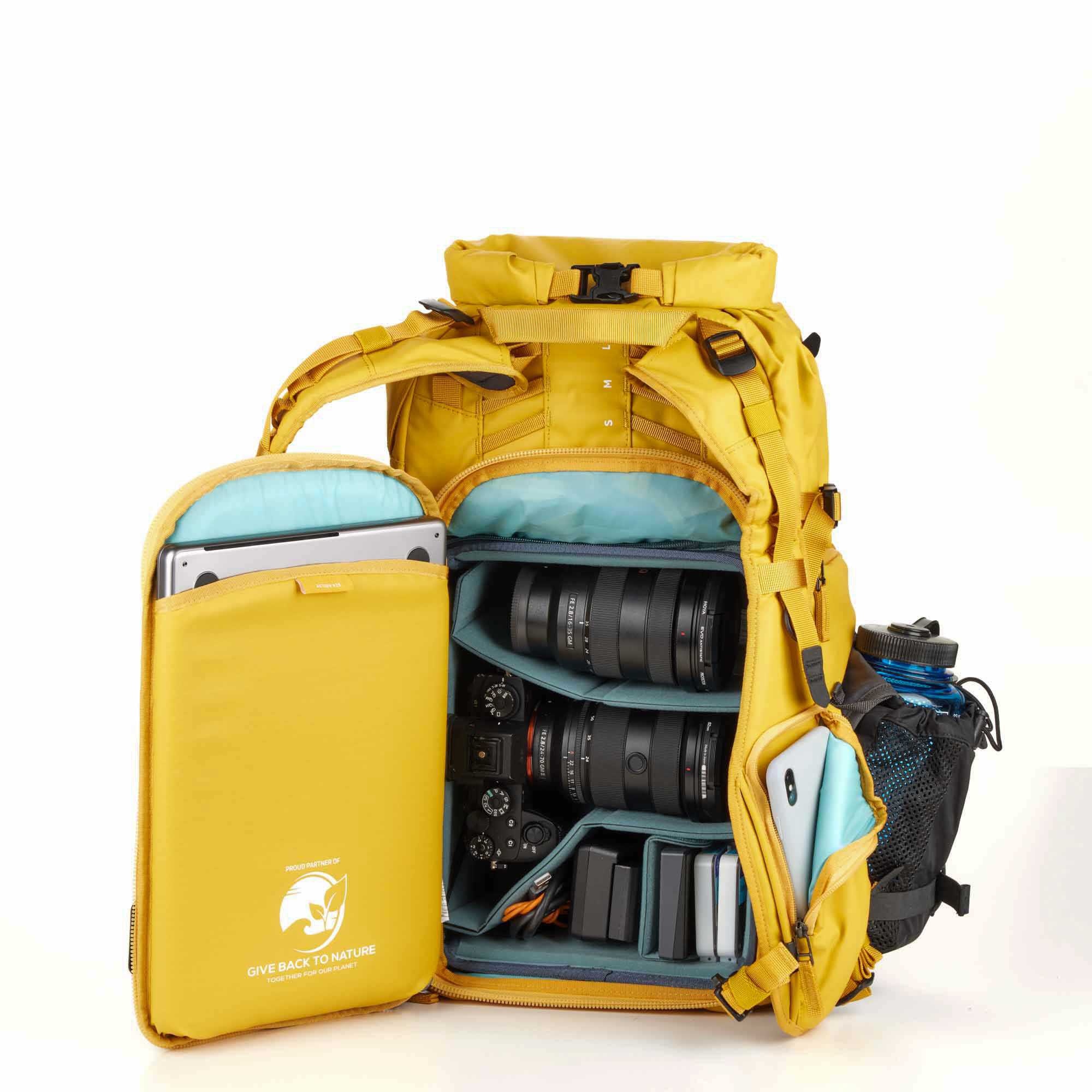 - De Action X25 heeft aan de zijkant een toegang naar de camera, twee verwijderbare statief- of waterfleszakken die naar wens naar de riem kunnen worden verplaatst voor directe toegang tot belangrijke accessoires zoals snacks en lenzen, of volledig kunnen worden verwijderd om gewicht te besparen.