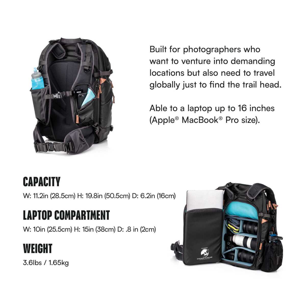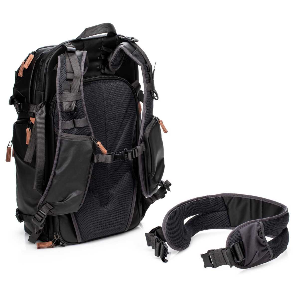 - De hoogte van het rugpand kan voor een perfecte pasvorm aangepast worden aan de lengte van de rug van de fotograaf.
